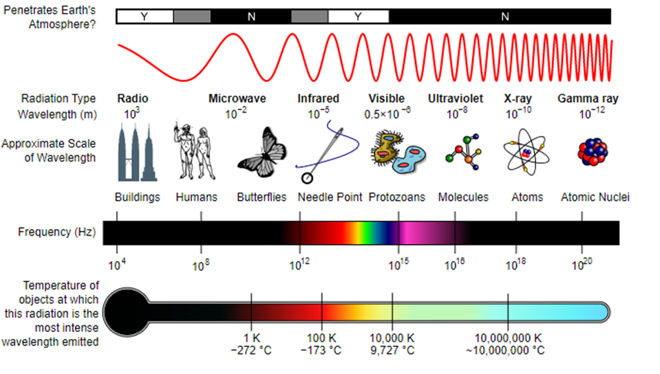 Den översta raden med Y:n och N:n visar vilken strålning som kan ta sig ned i atmosfären till Jorden. Y står för Yes och N står för No. Som ni ser så är det endast radiostrålning av en viss våglängd och synligt ljus som kan ta sig igenom atmosfären. De gråa rutorna är gråzoner. Men den översta radens svartvita/grå skala visar inte rätt eftersom det behövs en frekvens på väl över 9 MHz eller 9×106 svängningar per sekund (mitt emellan buildings och humans i Frequency Hz skalan ovan) för att tränga igenom atmosfären, och bilden visar felaktigt att man kan tränga igenom atmosfären med 104 Hertz radiofrekvens eller 10,000 svängningar per sekund. Den vita skalan Y till vänster längst upp skulle egentligen vara placerad där gråskalan är till höger om den. En hertz (1 Hz) är lika med en svängning per sekund, så 9 MHz är lika med 9 miljoner svängningar per sekund. Ljuset färdas i 300,000,000 meter i sekunden så det blir 300,000,000/9,000,000=33.3333 meter våglängd för 9 MHz. M i MHz står för Mega, alltså 1 miljon.